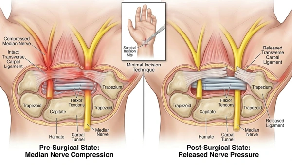 The procedure is performed to relieve stress on the median nerve of the wrist. The surgeon cuts off the ligament that presses on the nerve. There are various surgical options that are available, depending on the condition of the patient.