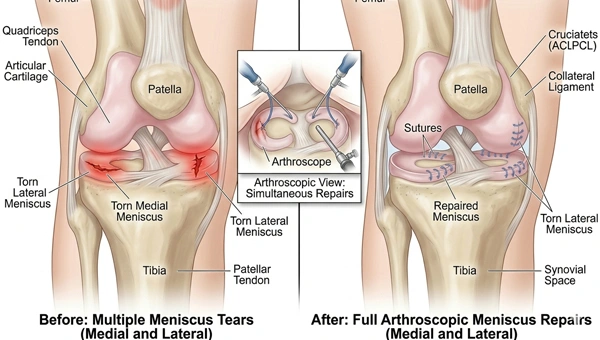 After meniscus repair surgery, patients need either short hospital stays or same-day discharges for their recovery process. The medical team administers pain relief medications to reduce pain and swelling in patients. Patients start their supervised physiotherapy program three days after surgery to develop their strength and flexibility. The timing of initial walking practice with assistance depends on the specific repair method used. The majority of patients resume their normal activities after four to eight weeks of treatment and periodic medical checkups.