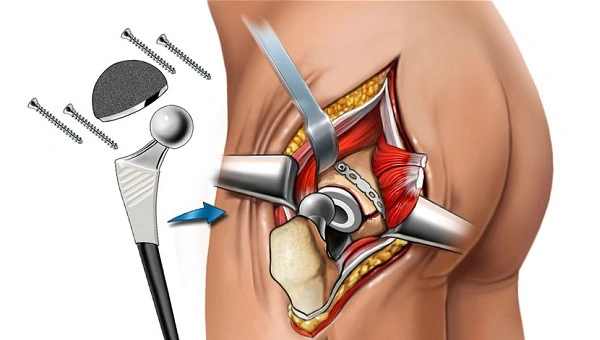 Total hip replacement Surgery is recommended when the hip joint is badly damaged and causes constant pain or stiffness. Common causes include osteoarthritis, hip fractures, rheumatoid arthritis injuries, and chronic joint wear. If cartilage wears away, bones rub against each other and can cause pain to the point of leading to surgery being required.